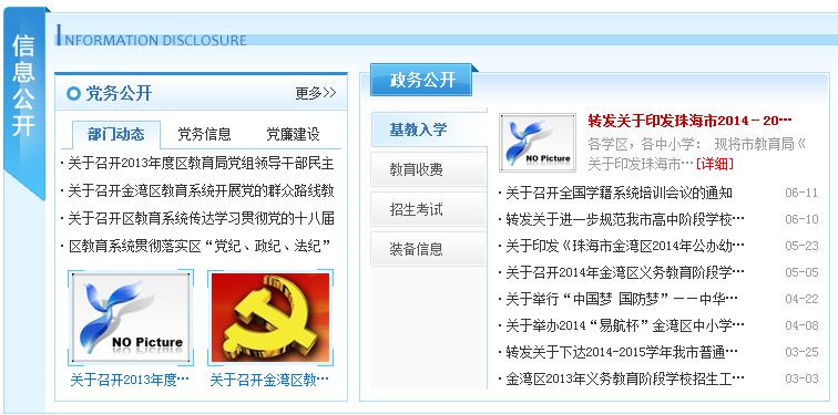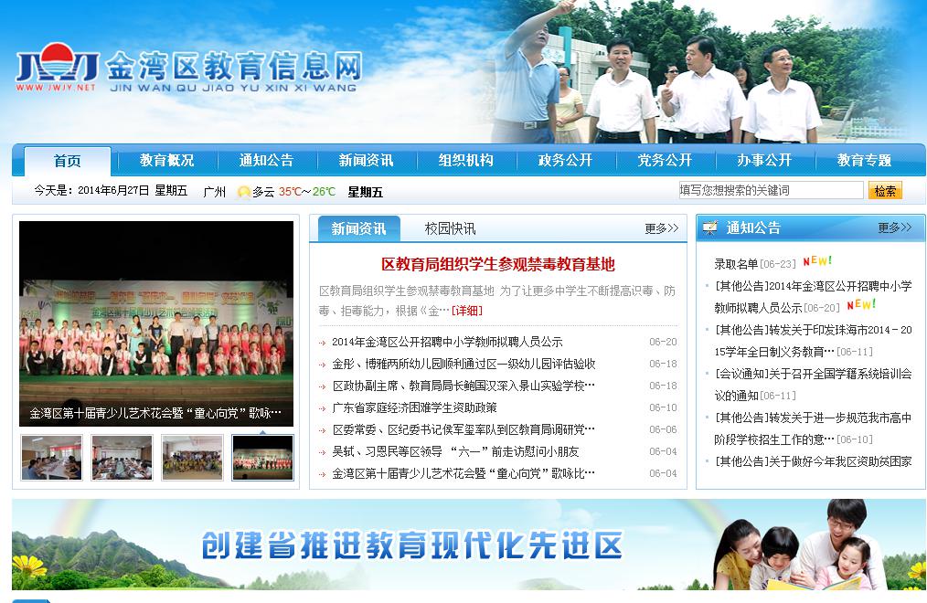 珠海市金灣區(qū)教育信息網(wǎng)(www.jwjy.net)是由金灣區(qū)教育局主辦的教育門戶網(wǎng)站, 是金灣教育在互聯(lián)網(wǎng)上對(duì)外展示的窗口,是發(fā)布金灣區(qū)權(quán)威教育信息、公開教育黨務(wù)、政務(wù)信息的重要平臺(tái),是廣大師生、家長(zhǎng)和社會(huì)公眾了解金灣教育、關(guān)注金灣教育的網(wǎng)絡(luò)媒介。金灣區(qū)教育信息網(wǎng)自2013年7月上線以來,充分整合政府信息資源,實(shí)現(xiàn)教育資源教育信息共享,為金灣區(qū)電子政務(wù)乃至珠海市在地區(qū)教育局門戶領(lǐng)域樹立領(lǐng)先形象,極大提高金灣區(qū)在相關(guān)領(lǐng)域的技術(shù)水平和管理服務(wù)理念,成為金灣區(qū)電子政務(wù)的中堅(jiān)力量,真正做到“全心全意為人民服務(wù)”。