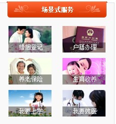 查看多屏優(yōu)化技術(shù)專題 >>玉龍縣政府門戶網(wǎng)站為用戶提供場(chǎng)景導(dǎo)航服務(wù)。圍繞需求組織相關(guān)場(chǎng)景、導(dǎo)航和服務(wù),提供可視化的場(chǎng)景式服務(wù),使公眾在最短時(shí)間內(nèi)對(duì)整個(gè)辦事流程和內(nèi)容了然于心,讓用戶做幾步簡(jiǎn)單的選擇,便可引導(dǎo)用戶獲取到合適的信息,獲取有高度針對(duì)性的服務(wù),節(jié)省時(shí)間。玉龍縣政府門戶網(wǎng)站場(chǎng)景式服務(wù)分為“婚姻登記”、“戶籍辦理”、“養(yǎng)老保險(xiǎn)”、“生育收養(yǎng)”、“我要上學(xué)”和“我要就醫(yī)”六部分,使用戶根據(jù)需求,按指引的辦事流程操作即可。