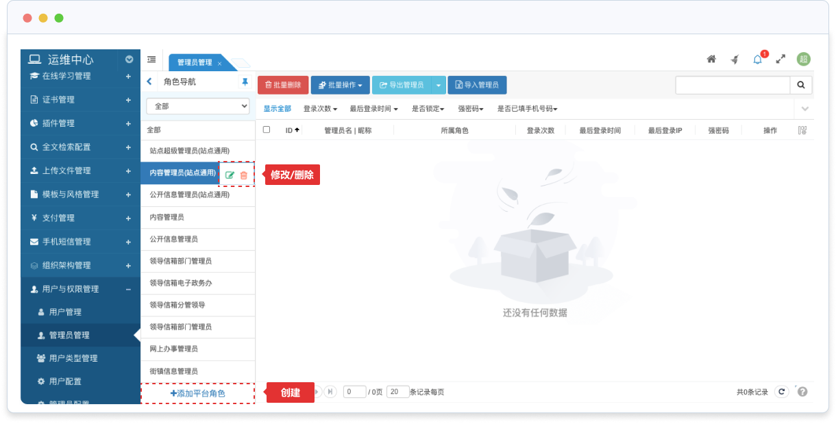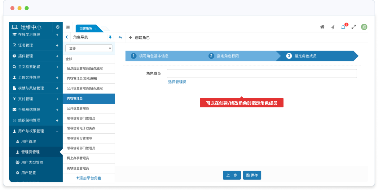 可以在創(chuàng)建/修改角色時指定角色成員,或者在管理員管理時設(shè)置管理員的權(quán)限(所屬角色)。