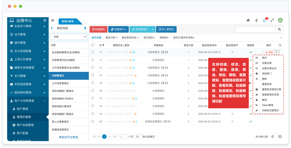支持創(chuàng)建、修改、查看、刪除、搜索、篩選、鎖定、解鎖、重置密碼、重置錯誤登錄次數(shù)、查看權(quán)限、批量刪除、批量鎖定、批量解鎖、批量重置密碼等常用功能;