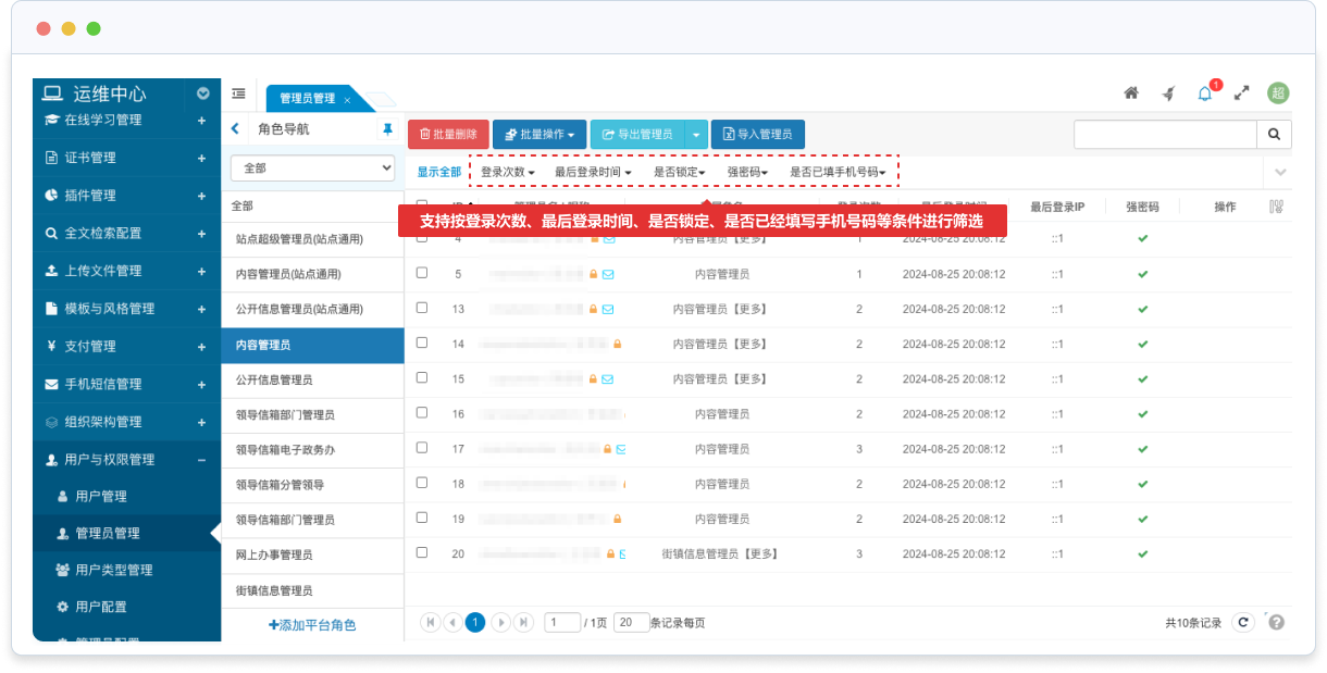 支持按登錄次數(shù)、最后登錄時間、是否鎖定、是否已經(jīng)填寫手機號碼等條件進行篩選;