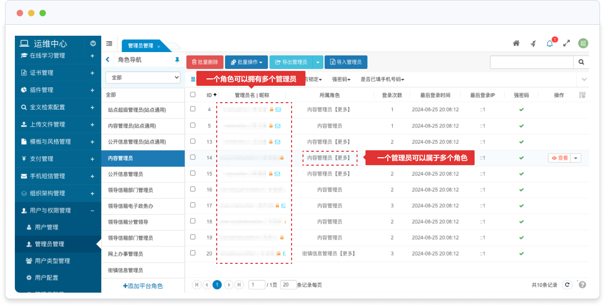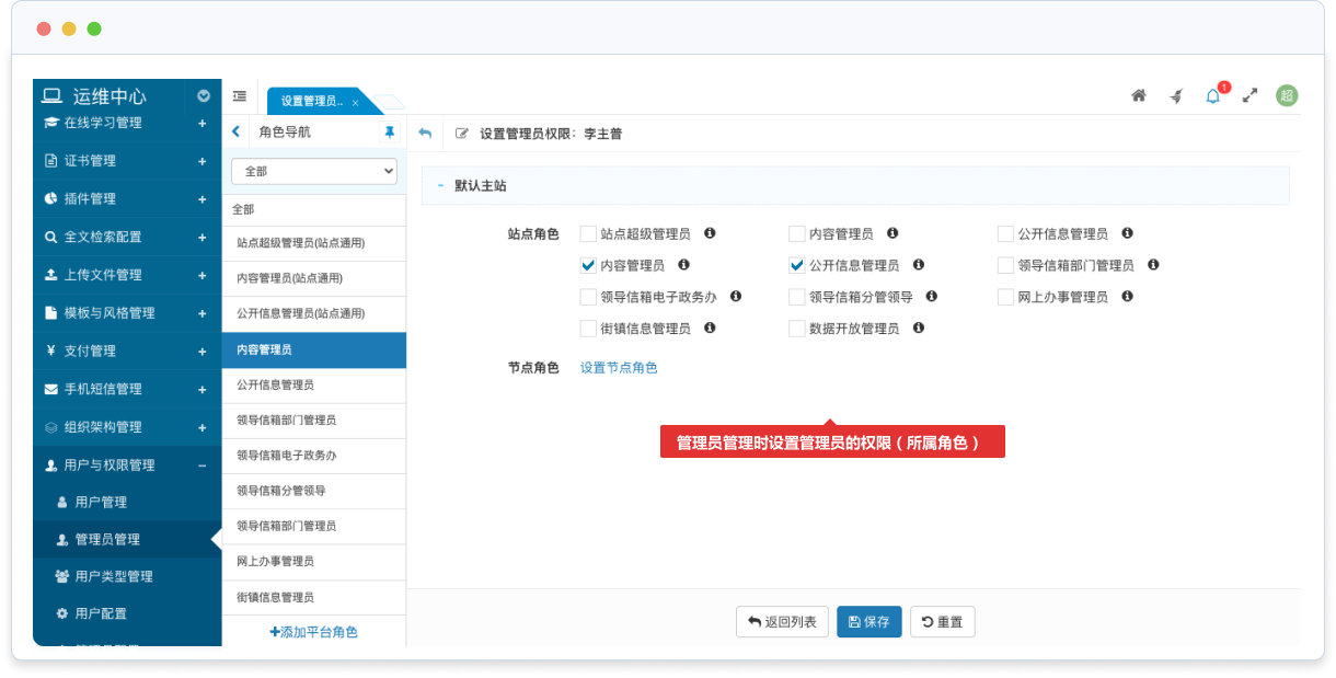 管理員可以歸屬于多個站點,在每個站點中可以屬于不同站點角色,以滿足跨站點管理的業(yè)務(wù)需求。