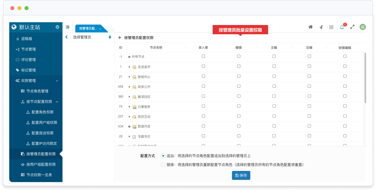節(jié)點角色的權(quán)限分配支持兩種批量操作方式:按節(jié)點批量設(shè)置權(quán)限和按管理員批量設(shè)置權(quán)限。按節(jié)點批量設(shè)置權(quán)限是指可以批量添加或替換指定節(jié)點的各節(jié)點角色的管理員;按管理員批量設(shè)置權(quán)限是指可以批量添加或替換指定管理員在各節(jié)點中的節(jié)點角色。