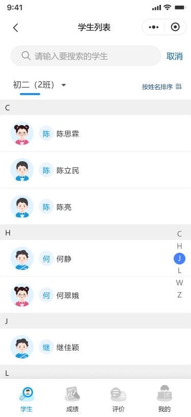按年級顯示班級,進(jìn)入班級后可查看學(xué)生列表,支持按姓名或?qū)W號排序,姓名排序支持字母快速跳轉(zhuǎn)和搜索功能。