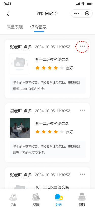 支持科任老師查看自己錄入的評價記錄,可按評價項(xiàng)目分類篩選,支持修改和刪除自己的評價。