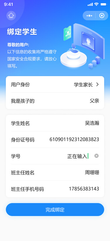 登錄與綁定學(xué)生學(xué)生及家長登錄后,需先綁定學(xué)生信息。綁定時需輸入學(xué)生姓名、身份證號、學(xué)號、班主任姓名、班主任手機(jī)號等信息,確保準(zhǔn)確性。一個學(xué)生最多支持綁定4個用戶賬號,需指定與學(xué)生的關(guān)系和家長身份用于通信稱呼。