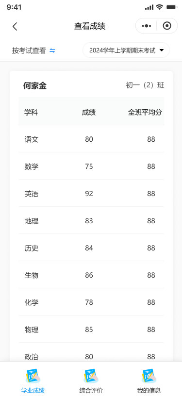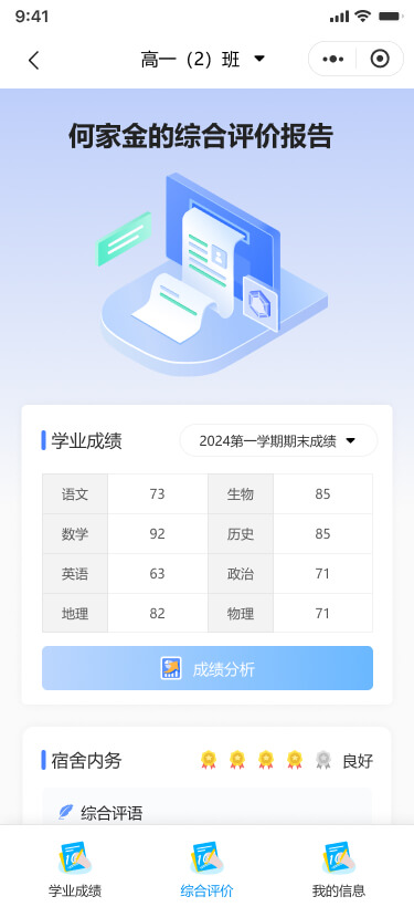 查看綜合評價綜合評價頁面包含學(xué)生的歷次考試成績、各類獎勵和評價記錄。