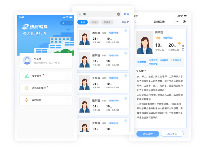 在小程序主頁(yè)點(diǎn)擊“我要報(bào)考”后,系統(tǒng)將展示導(dǎo)師列表,學(xué)生可以根據(jù)職稱、學(xué)歷、研究方向等條件篩選導(dǎo)師。點(diǎn)擊導(dǎo)師名稱可以查看其詳細(xì)信息以及報(bào)考該導(dǎo)師的相關(guān)數(shù)據(jù)。學(xué)生可以將導(dǎo)師加入備選或取消備選,并最終確認(rèn)報(bào)考。