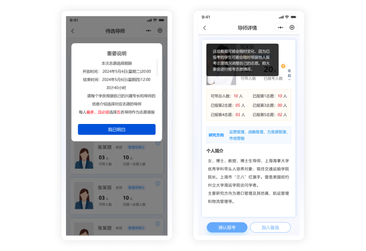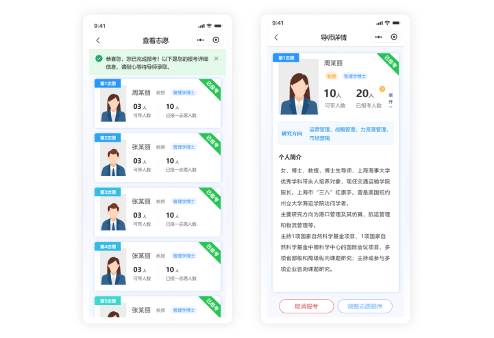 在報(bào)考截止時(shí)間之前,學(xué)生可以隨時(shí)查看和調(diào)整報(bào)考志愿,包括取消報(bào)考或通過(guò)拖拽方式調(diào)整志愿順序。每個(gè)導(dǎo)師的報(bào)考名額有配置限制。