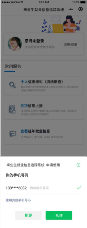 畢業(yè)生登錄小程序學(xué)?;虬嘀魅卫梦⑿湃旱榷喾N渠道發(fā)布填報(bào)通知,畢業(yè)生接獲通知后,通過(guò)掃描通知中二維碼快速進(jìn)入小程序。小程序自動(dòng)申請(qǐng)獲取當(dāng)前微信賬戶關(guān)聯(lián)的手機(jī)號(hào)信息,并與畢業(yè)生數(shù)據(jù)庫(kù)進(jìn)行精準(zhǔn)匹配: