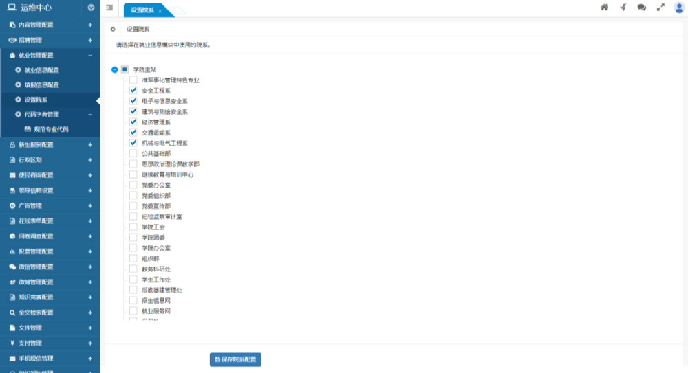 院系、專業(yè)、班級(jí)管理院系為全局部門的子集,可以配置全局部門中在就業(yè)信息管理模塊中啟用的部門做為院系。