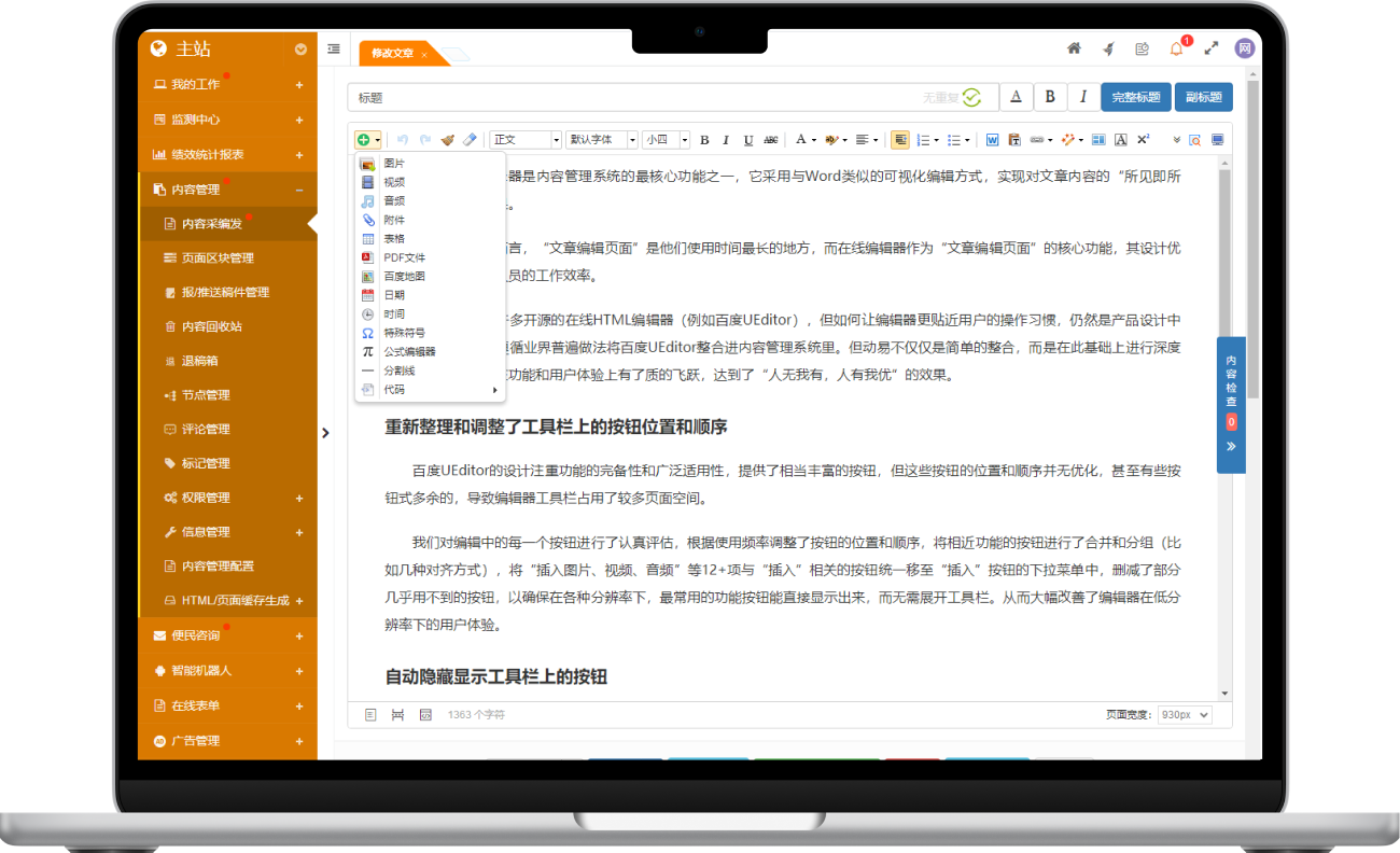 基于 UEditor 深度優(yōu)化,采用類 Word 可視化編輯方式、全面適配多設備,讓內(nèi)容編輯更輕松。