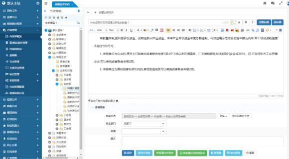 業(yè)務(wù)知識庫是在內(nèi)容管理系統(tǒng)的基礎(chǔ)上深度開發(fā)而成,作為內(nèi)容模型的一部分,業(yè)務(wù)知識庫的分類管理已整合在節(jié)點(diǎn)管理模塊中,業(yè)務(wù)知識管理則集成于內(nèi)容采編發(fā)模塊。這種深度整合使得業(yè)務(wù)知識庫能夠充分利用內(nèi)容管理系統(tǒng)的各項強(qiáng)大功能,如節(jié)點(diǎn)權(quán)限控制、報送/推送、錯別字檢查,敏感信息檢查、全文檢索,智能問答,頁面輸出緩存等,大大提升了系統(tǒng)的功能性和使用效率。