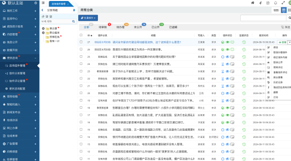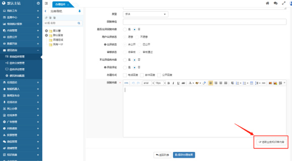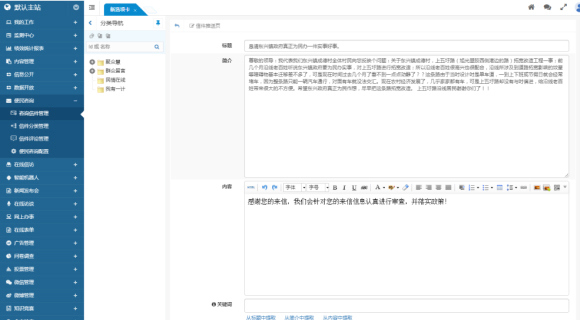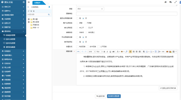 在回復(fù)留言、信件等互動信息時,由于內(nèi)容需要體現(xiàn)業(yè)務(wù)知識和政府的公正形象,系統(tǒng)預(yù)先整合了大量經(jīng)典案例和回復(fù),形成一套業(yè)務(wù)知識庫。后臺處理人員在辦理和回復(fù)信件時,可以方便地檢索業(yè)務(wù)知識庫,快速找到參考內(nèi)容,從而實(shí)現(xiàn)高效且高質(zhì)量的互動處理。