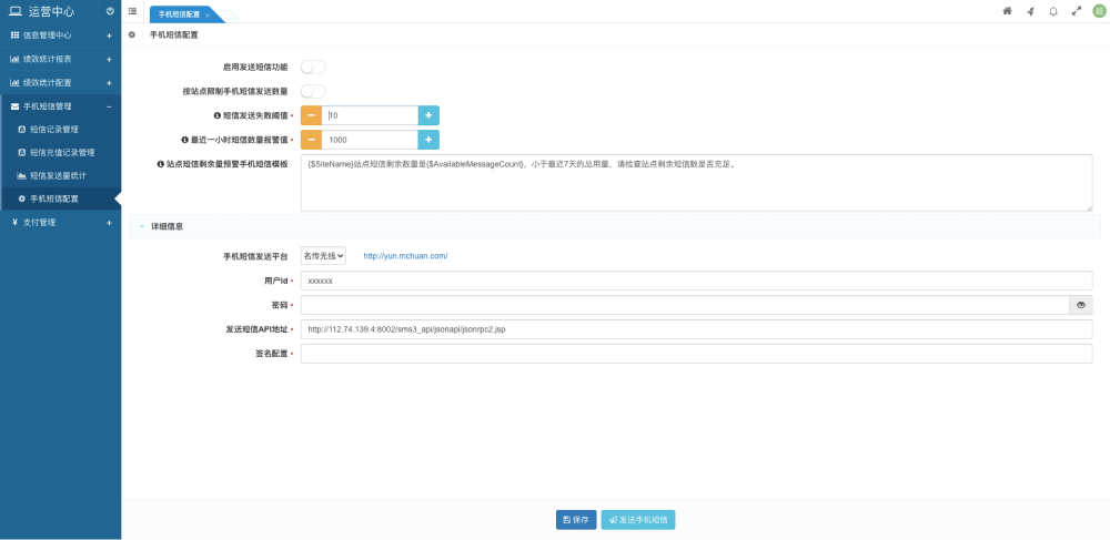 系統(tǒng)每20分鐘統(tǒng)計一次短信記錄表中的最近一小時的短信數量,若超過報警值(可配置),將向平臺超管發(fā)送報警短信。