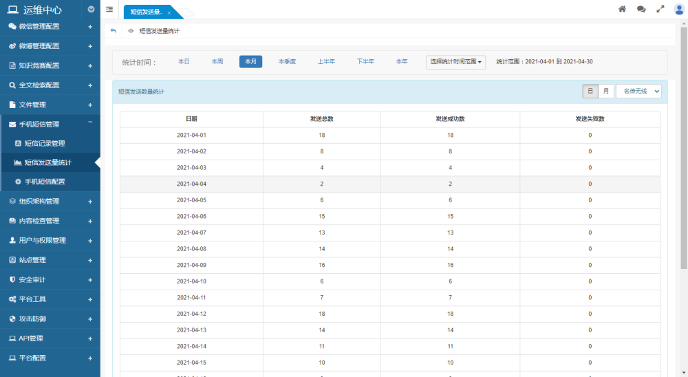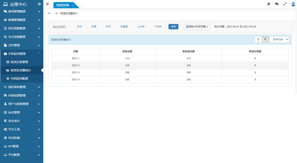 提供按日和按月兩種統(tǒng)計表。統(tǒng)計每日/每月發(fā)送的短信發(fā)送總量、發(fā)送成功數量、發(fā)送失敗數量。便于與短信服務商進行對帳。