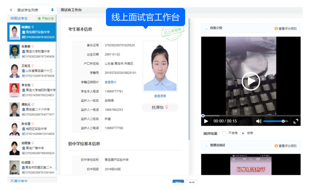 對于審核通過的考生,其查看頁面還會(huì)展示各測評項(xiàng)目的視頻上傳信息及測評結(jié)果,對于處于測評中狀態(tài)的考生,查看頁支持“允許考生重新上傳視頻”的功能,而對于測評中及后續(xù)狀態(tài)的考生,查看頁的測評項(xiàng)目還支持“重置測評結(jié)果”操作,以應(yīng)對某些特殊情況下的需求調(diào)整。