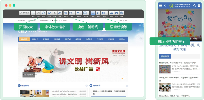 內(nèi)置了無障礙訪問系統(tǒng)和長者助手,專門提供了長者版模板,讓老年人、功能障礙人士等特殊訪問對(duì)象也可以獲得最佳的訪問體驗(yàn)。認(rèn)真對(duì)照無障礙和適老化方面的國家規(guī)范、評(píng)測和認(rèn)證標(biāo)準(zhǔn)對(duì)頁面模板進(jìn)行了全面優(yōu)化,以保證符合有關(guān)國家規(guī)范和標(biāo)準(zhǔn)。