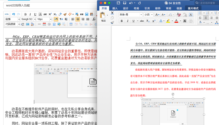全新架構(gòu)的動(dòng)易SiteAzure 支持在線導(dǎo)入 Word 文檔,系統(tǒng)將自動(dòng)對(duì)文檔內(nèi)容、字體格式、排版進(jìn)行識(shí)別并保留 Word 文檔樣式,可在內(nèi)容編輯器中可視化展示;同時(shí),Word 文檔中的圖片、表格等文件將自動(dòng)上傳直接顯示在編輯器里,用戶可以在編輯器中繼續(xù)編輯或排版,也可以無(wú)需編輯排版而直接發(fā)布。發(fā)布的文章在網(wǎng)站前臺(tái)展示的效果和 Word 文檔中的效果一致。