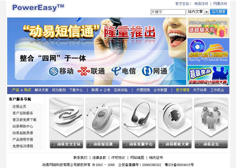 新的導(dǎo)航首頁的設(shè)計(jì)更加符合瀏覽者的使用習(xí)慣,文字菜單部分更加清晰明了,同時(shí)采用了較多的圖片按鈕作為特色功能的入口,將更加方便瀏覽者尋找自己所需要的網(wǎng)站資訊內(nèi)容。導(dǎo)航頁面還特別設(shè)計(jì)了客戶服務(wù)導(dǎo)航的快速功能鏈接,以引導(dǎo)用戶迅速明確的使用動(dòng)易產(chǎn)品。