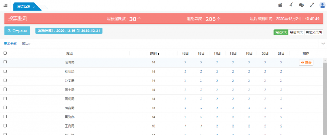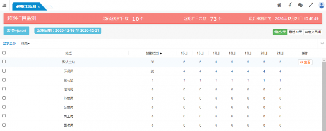 按站點(diǎn)顯示各站點(diǎn)的超期欄目監(jiān)測情況。
