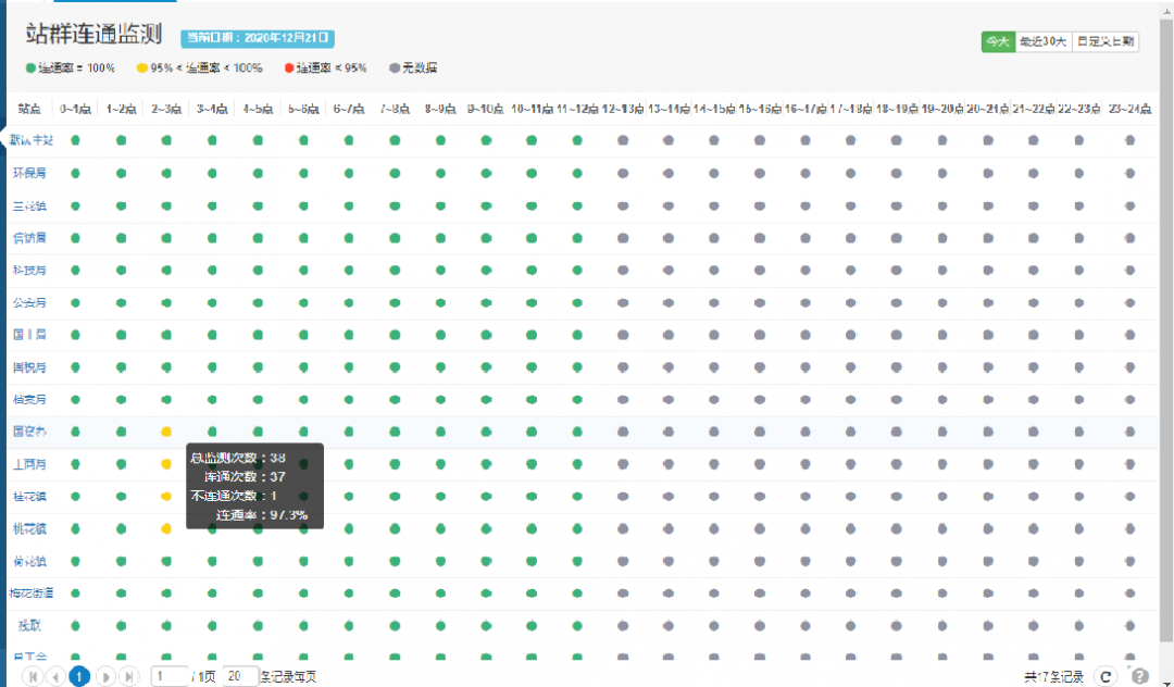 采用仿交換機(jī)面板的亮燈圖方式顯示所有站點(diǎn)的連通監(jiān)測結(jié)果,可直觀了解到各時(shí)間段連通情況。