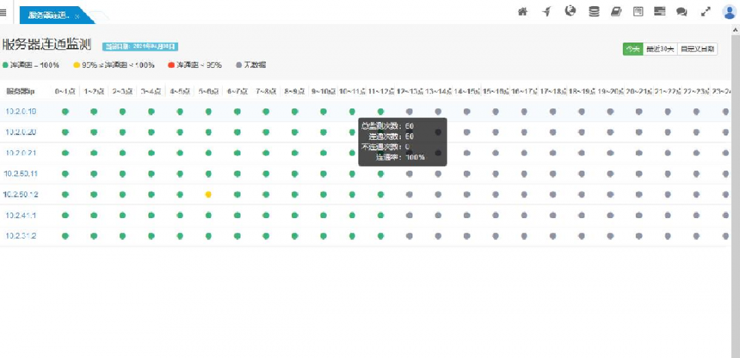 采用仿交換機(jī)面板的亮燈圖方式顯示所有服務(wù)器的連通監(jiān)測結(jié)果,可以直觀的了解到各時(shí)間段連通情況。