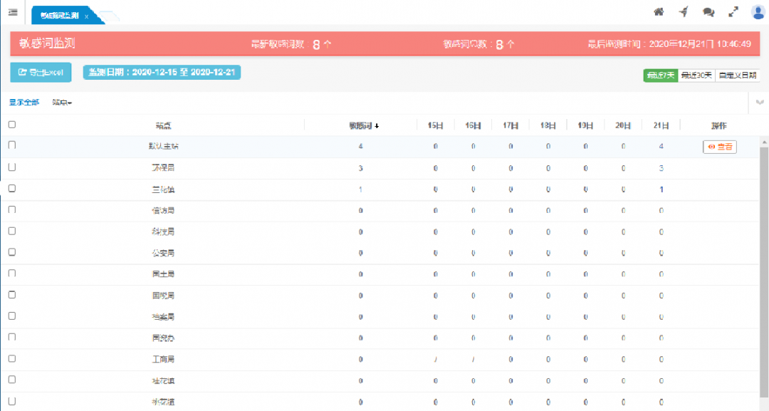 按站點(diǎn)顯示各站點(diǎn)的敏感詞監(jiān)測情況。