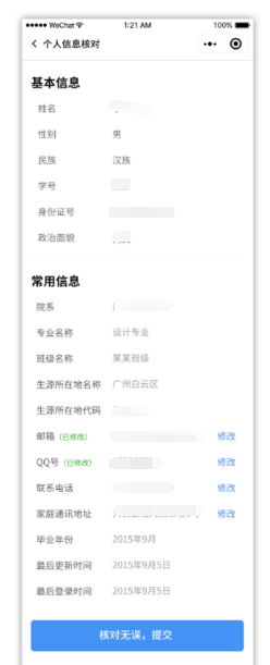 畢業(yè)生對本人信息進(jìn)行核對,如信息有誤可在小程序中修改并提交,并由院系用戶或輔導(dǎo)員(管理員)進(jìn)行數(shù)據(jù)審核。