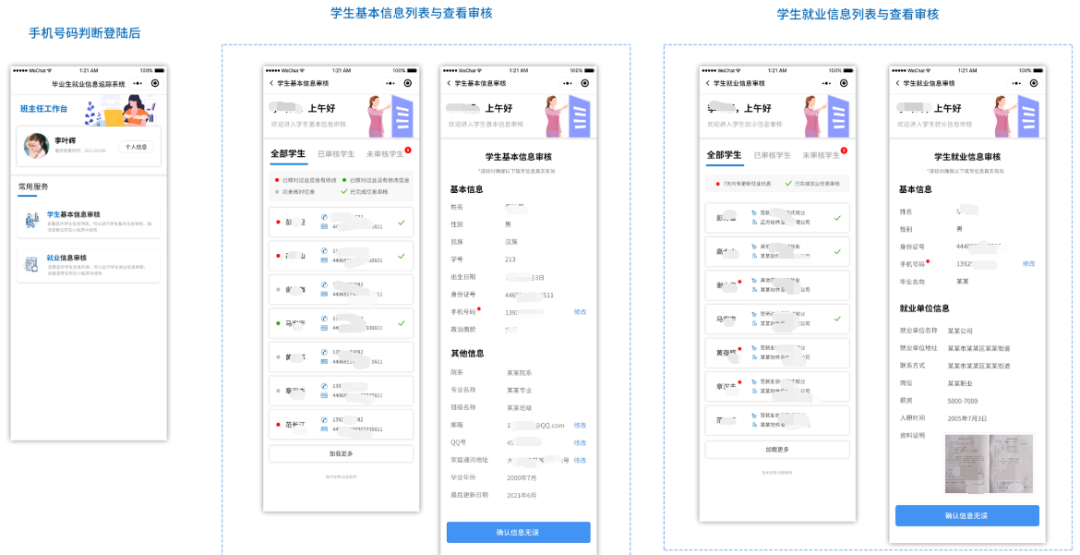 畢業(yè)生在小程序中填報(bào)就業(yè)信息后,管理員在后臺(tái)對學(xué)生提交的就業(yè)信息進(jìn)行初審和終審。審核不通過的就業(yè)信息,會(huì)微信通知學(xué)生進(jìn)行修改并重新上報(bào)。