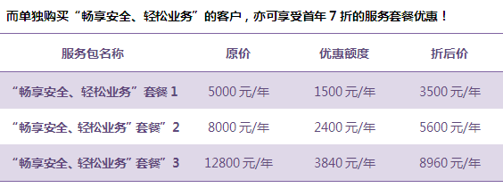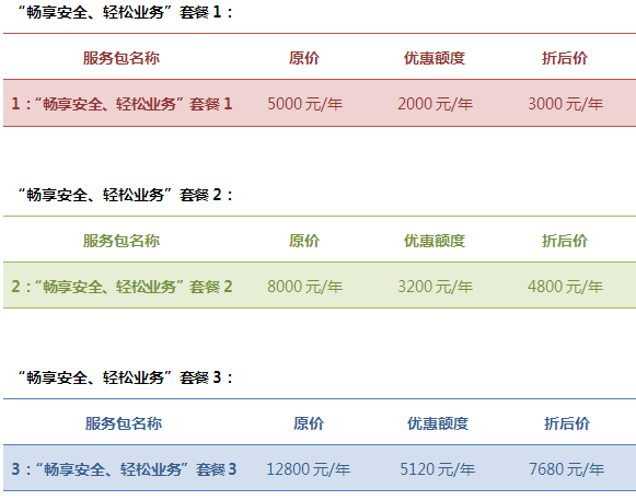 | 服務(wù)項(xiàng)目 | 暢享安全 輕松業(yè)務(wù) 套餐1 | 暢享安全 輕松業(yè)務(wù) 套餐2 | 暢享安全 輕松業(yè)務(wù) 套餐3 |