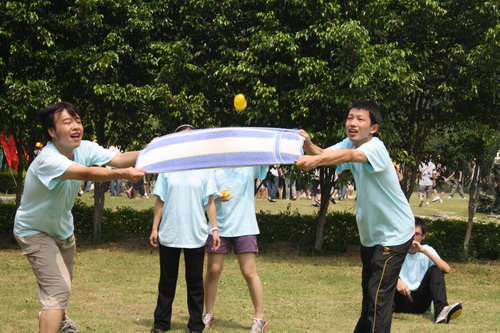 第一個(gè)正式的拓展項(xiàng)目名稱叫做“南水北調(diào)”,玩法是各組每2人站成一對(duì),每對(duì)人手上拿一塊毛巾,每組分配有30個(gè)汽球全部裝好水,將水球放到毛巾上,每次一個(gè)由各隊(duì)成員依次以接龍形式從第一對(duì)隊(duì)員手中的毛巾上傳送到最后一對(duì)隊(duì)員手里的毛巾上,最后把水球送到終點(diǎn)的桶里,拿到最多水球的隊(duì)伍可得最高分。初聽說明時(shí)貌似這個(gè)游戲很簡單,到真正進(jìn)行時(shí)才發(fā)現(xiàn)遠(yuǎn)遠(yuǎn)不是想象中那么容易:因?yàn)槊繉?duì)隊(duì)員相距好幾米遠(yuǎn),要利用毛巾的彈力將水球準(zhǔn)確無誤地送到下一對(duì)隊(duì)員手中的毛巾上,兩個(gè)人的力道要配合的相當(dāng)好,用力過猛水球就飛過頭了,用力太輕水球又飛不過去,而且水球砸在地上,很容易就破掉了。所以在開始一段時(shí)間內(nèi),我們隊(duì)毫無進(jìn)展,有時(shí)候好不容易前兩對(duì)的人員運(yùn)送成功,下一組的運(yùn)送又失敗了。不過幸好每隊(duì)安排有一個(gè)靈活撿球的“走鬼”,這下子就苦了我們隊(duì)里的小歐童鞋,他四處飛奔,不僅要撿回自己隊(duì)拋丟在地上的球,還要瞅準(zhǔn)空子去撿別隊(duì)的球,以保證我們的隊(duì)員們有更多的球可以使用,幾番下來,他已經(jīng)累得滿頭大汗、氣喘吁吁。除了“走鬼”之外,其他人都是不可以碰球的,所以我們這些旁觀者看了只有干著急。不過到了最后,基本上已經(jīng)無法嚴(yán)格控制了,每隊(duì)都在爭著找球、拋球,混水摸魚者自是不在話下。到了最后幾分鐘的時(shí)間里,我們隊(duì)也不管三七二十一,只要有球就用力拋,有一次從第一對(duì)越過中間幾對(duì),直接拋到了最后一隊(duì),居然也成功了,嘿嘿,功力確實(shí)深厚,但也不得不說頗有運(yùn)氣的成份了。
