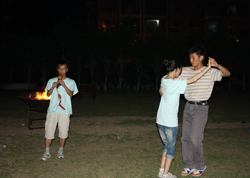 晚上的篝火晚會(huì)沒有了白天分?jǐn)?shù)的爭奪,大家都徹底放松了。開場的一個(gè)小游戲讓大家都笑岔了氣,被抓上場每個(gè)人都要說一個(gè)類似于“紅通通”這一類的形容詞,最后才知道這個(gè)詞是用來形容自己的PP的,于是“我的屁股綠油油”、“我的屁股香噴噴”……各種形容層出不窮,配合當(dāng)時(shí)的情境那真是有說不出的有趣。接下來的“環(huán)保服裝秀”更是讓大家大開眼界,沒想到短短的時(shí)間內(nèi),每個(gè)隊(duì)都做出了三套以上的衣服,而且各種設(shè)計(jì)獨(dú)特別致,遠(yuǎn)遠(yuǎn)出乎我們的意料之外。小羊的“濟(jì)公裝”配了一把漂亮的扇子,他走路的那個(gè)姿態(tài)真叫一個(gè)嫵媚;小胖的“武士裝”穿在他身上,倒頗有些中世紀(jì)武士的味道,但仔細(xì)再看看,又有些象中國古代的道人,還有大斌的“火箭裝”,劉藝的不知道叫什么名字的服裝……哈哈,精彩之處太多了,無法一一形容。輪到我們隊(duì)的兩大猛男上場表演的時(shí)候,阿欣超有創(chuàng)意地制造出一件世界上獨(dú)一無二的樹葉上裝,NONO為了集體的榮譽(yù)真是徹底豁出去了,索性脫了上裝“性感”上陣,我臨時(shí)做了一朵紙花,本想幫福娃戴在頭上,奈何汗流的太多,用膠帶怎么都貼不上,他索性將紙花咬在嘴里,兩人妖嬈地上場了,立即引起大家一片尖叫和哄笑。精彩的服裝秀環(huán)節(jié)之后,野狼隊(duì)和十八羅漢隊(duì)各出了一個(gè)小節(jié)目,靚女阿靜上場秀了一把歌喉,帥哥阿靖出場露了一手魔術(shù)。雖然我們隊(duì)不用出節(jié)目,但為了助興,我們的隊(duì)員小歐主動(dòng)亮出了自己的拿手才藝――葫蘆絲表演,從來不知道小歐的葫蘆絲吹的那么好,音樂一響起,大家已經(jīng)在瘋狂地拍手了,一曲婉轉(zhuǎn)美妙的《月光下的鳳尾竹》聽得大家如癡如醉,我們隊(duì)的勝德和陳陳自告奮勇地上場翩翩起舞,一時(shí)間熊熊的篝火、悠揚(yáng)的葫蘆絲、曼妙的舞姿,在點(diǎn)點(diǎn)燈光映照的夜空下,真是一幅無比美妙的圖畫。