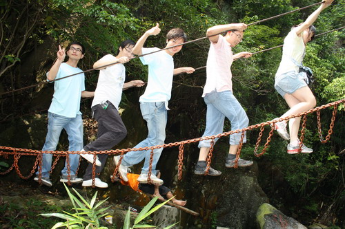 活動(dòng)的第一天9月20日是星期天,大家個(gè)個(gè)精神抖擻,很早就到了公司集合。上車后大家笑笑鬧鬧,一路飛歌,早上9點(diǎn)多就到了目的地。在換好拓展公司統(tǒng)一發(fā)放的T恤并做了幾個(gè)熱身的小活動(dòng)后,大家就開始進(jìn)入第一天活動(dòng)的準(zhǔn)備階段---建立團(tuán)隊(duì)。所有人按照?qǐng)?bào)號(hào)的順序分成了四隊(duì)后,就分組去開始討論自己的隊(duì)名、口號(hào)和隊(duì)歌。我被分到了第一隊(duì),福娃自告奮勇當(dāng)了隊(duì)長,因?yàn)榇蠹移綍r(shí)喜歡叫他雷娃,所以我們的隊(duì)名很順理成章就叫了“雷隊(duì)”,口號(hào)就是“雷!很雷!非常雷!”,之后也不知道誰的提議,隊(duì)歌就用了“妹妹你坐船頭,哥哥在岸上走,恩恩愛愛纖繩蕩悠悠……”這幾句,于是乎無比響亮的一句口號(hào)配上了相當(dāng)軟綿綿的幾句歌詞,倒也頗顯我們隊(duì)剛?cè)岵?jì)的特色。其他幾的隊(duì)隊(duì)名、風(fēng)格各異,有叫十八羅漢隊(duì)的,有叫野狼隊(duì),更有甚者叫劍人隊(duì)(此“劍”還是彼“賤”?大家可自由聯(lián)想)。我們隊(duì)的人員相當(dāng)齊心,在第一輪的展示和團(tuán)隊(duì)小游戲中就拿了第一個(gè)高分,當(dāng)然這是后話。