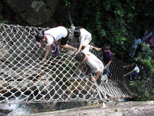 下午的活動(dòng)“山谷探險(xiǎn)”就顯得比較簡單了,說白了就是去登山。我們所去的二龍谷是位于景區(qū)內(nèi)一條比較隱蔽的幽谷,景區(qū)為了滿足游客的需要,在一些險(xiǎn)要位置增加了鋼索吊橋、輪胎索等設(shè)施。我們先乘車去了山谷的入口處,然后從橫跨河道的鋼索吊橋進(jìn)入山谷,沿著溪水溯溪而上,踩過輪胎索,越過“仙月池”,攀登“天梯”,有好幾處必須要手腳并用才可以爬上去,原來拿在手里的礦泉水也因?yàn)榈K事在半路上丟掉了,后來才發(fā)現(xiàn)這真是一個(gè)錯(cuò)誤的決定,因?yàn)橐宦放实巧先ズ顾疂L滾而下,不到一會(huì)兒就恨不得能喝下一桶水,雖然沿途的溪水不斷從石縫間潺潺淌流出來清澈見底,但始終還是不敢去冒然喝解渴,唯有歇息下來的時(shí)候洗把臉,或者拿來當(dāng)作“武器”來澆一澆其他的同事,倒也為這悶熱的天氣帶來一份清涼。正所謂上山容易下山難,下山的時(shí)候我感覺自己的腿一直在打顫,好不容易一路顛簸著下山了,坐在入口處的涼亭處,吹著習(xí)習(xí)的涼風(fēng),嗅著山里獨(dú)有的樹木的清香,看著鋼索橋下一路漂流下來歡騰的人們,那一瞬間真有種置身世外的感覺。