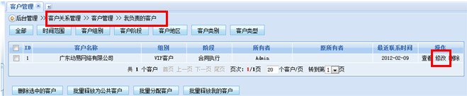 首先,進(jìn)入首先進(jìn)入系統(tǒng)后臺(tái)“客戶(hù)關(guān)系管理”界面,在“我的客戶(hù)”中點(diǎn)擊“修改”功能按鈕。