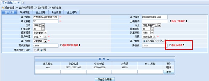 這樣,整個(gè)協(xié)銷(xiāo)的設(shè)置工作就成功完成了,2位銷(xiāo)售人員可以共同查看、修改此客戶(hù)的相關(guān)資料,齊心合力完成項(xiàng)目的銷(xiāo)售以及跟進(jìn)工作。協(xié)銷(xiāo)功能的介紹就為大家介紹到這里,趕快來(lái)體驗(yàn)一下吧!