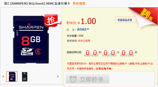 如下圖是蘇寧易購一元秒殺專區(qū),30件超高性價比商品被瞬間秒殺: