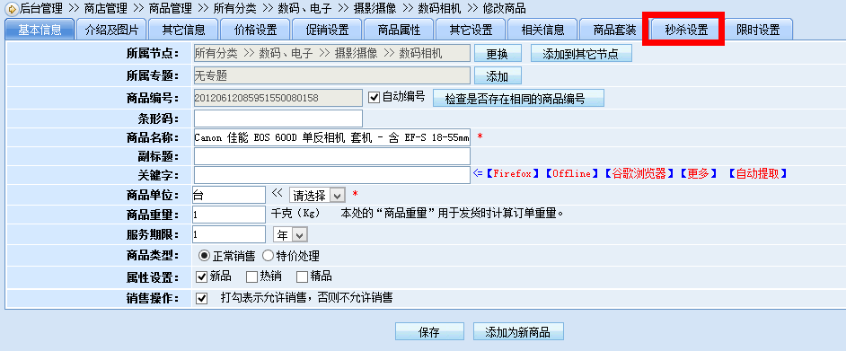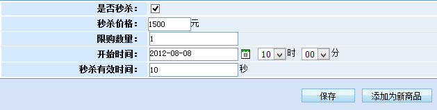 點擊“秒殺設(shè)置”功能選項卡,進入秒殺功能設(shè)置界面,并開啟秒殺,如下圖:
