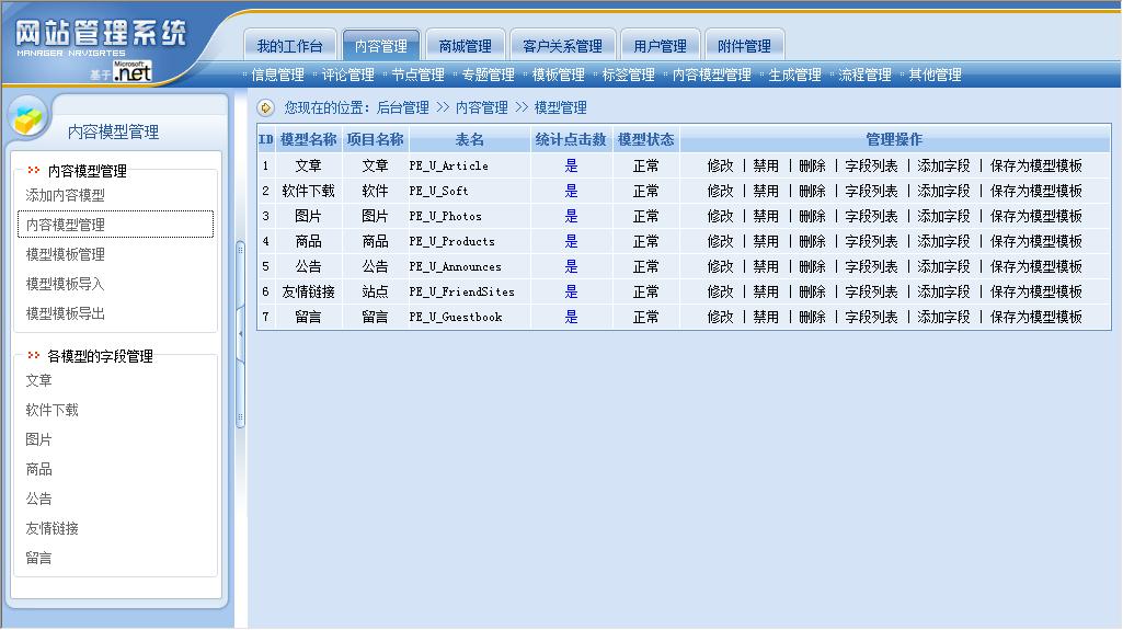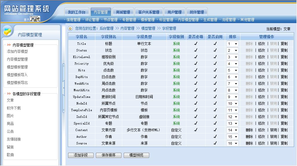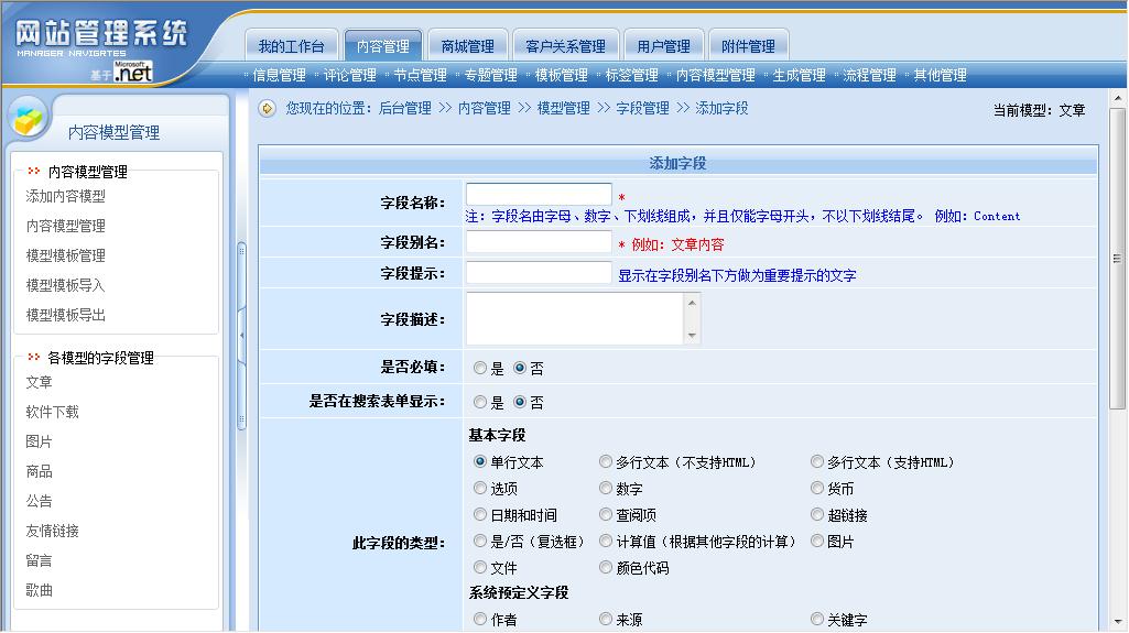 內(nèi)容模型就是將系統(tǒng)原來的“文章”、“下載”、“圖片”、“商品”、“公告”、“友情鏈接”、“留言”、“供求信息”、“房產(chǎn)信息”等功能模塊統(tǒng)一抽象為“內(nèi)容模型”,所有模型的所有字段都可以由站長進(jìn)行控制。動易CMS 2007版系統(tǒng)會內(nèi)置“文章”、“下載”、“圖片”、“商品”、“公告”、“友情鏈接”、“留言”、“供求信息”、“房產(chǎn)信息”等常用內(nèi)容模型(可能會根據(jù)版本不同而有所區(qū)別)以方便用戶直接使用。站長也可以根據(jù)需要,隨時添加新的內(nèi)容模型,如:可以添加Flash模型、影視模型、音樂模型、課件模型、教案模型……等等,需要什么內(nèi)容模型就可以添加和創(chuàng)建什么內(nèi)容模型。當(dāng)然,站長也可以隨時修改、刪除或禁用系統(tǒng)已有的內(nèi)容模型。對于內(nèi)置的內(nèi)容模型,站長也可以對模型的字段進(jìn)行管理(包括添加、刪除、修改、排序等管理操作)。
