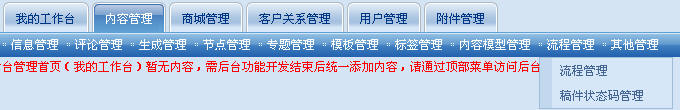 但是2006版中,第一流程不可定制、第二僅限于制定的這些過程。但是到了SiteFactory 版中,首次出現(xiàn)了“流程管理”和“狀態(tài)代碼管理”兩個(gè)菜單?!肮ぷ髁鳌钡膽?yīng)用遍及網(wǎng)站管理的方方面面。