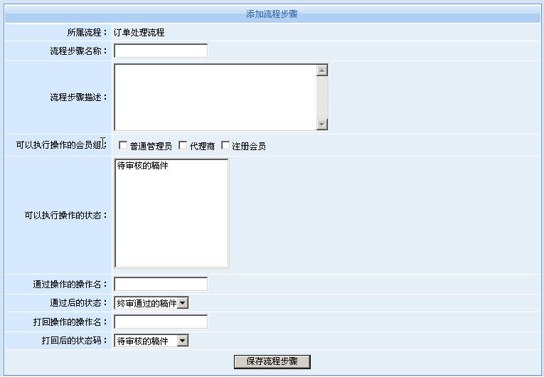 在動(dòng)易SiteFactory 中,我們只要?jiǎng)?chuàng)建幾個(gè)用戶組,例如信息組、采購(gòu)組、物流組這樣幾個(gè)組,然后創(chuàng)建待處理、配貨中、已配貨、發(fā)貨中、已發(fā)貨等幾個(gè)狀態(tài)碼。然后創(chuàng)建“訂單處理流程”,設(shè)置每個(gè)步驟中可操作的用戶組、經(jīng)過該步驟處理訂單狀態(tài)發(fā)生的變化等。就可以完全實(shí)現(xiàn)和互動(dòng)出版社一樣的工作流程。