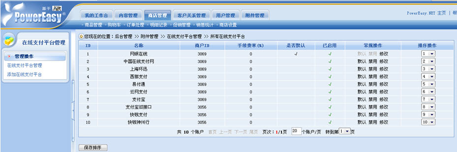 在動易eShop2007里,系統(tǒng)可添加的支付平臺數(shù)量是沒有上限的,網(wǎng)店可以任意添加多個(gè)支付平臺。此外,我們還可對支付平臺的先后順序進(jìn)行排序管理。