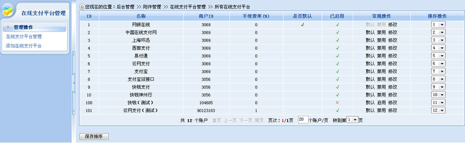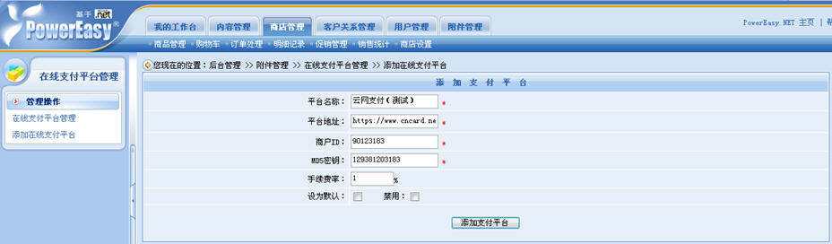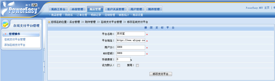 操作步驟:后臺——商店管理——商店設(shè)置——在線支付平臺管理。在這里,商家可以自由地添加、禁用、修改以及設(shè)置默認(rèn)的在線支付平臺,而且修改與設(shè)置默認(rèn)的操作非常簡單。