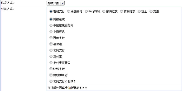 在動易eShop 2007,網(wǎng)店顧客可在所有支付平臺中任意選擇一種來進(jìn)行貨款支付,見下圖: