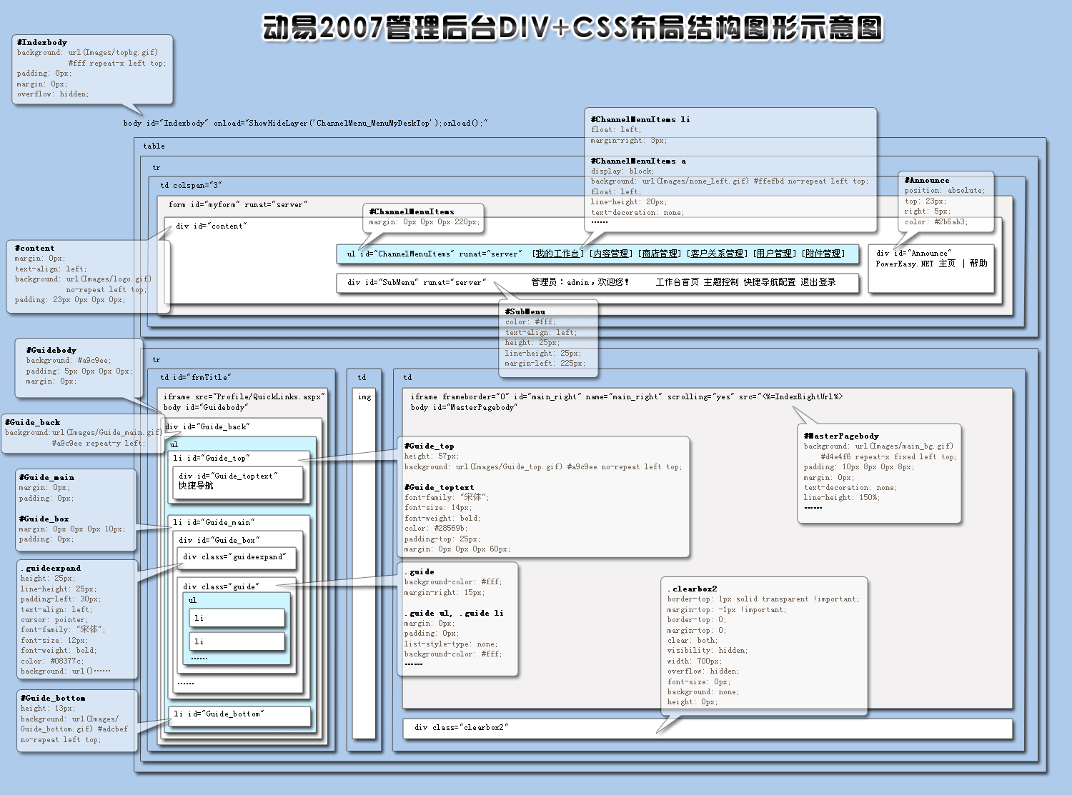 如果要完全修改管理后臺(tái)的布局與樣式,則需要修改到上述相關(guān)文件。.aspx和.css文件相配合,控制后臺(tái)頁(yè)面結(jié)構(gòu)與樣式,在了解管理后臺(tái)設(shè)計(jì)前,請(qǐng)先仔細(xì)閱讀并理解管理后臺(tái)的結(jié)構(gòu)圖形示意圖: