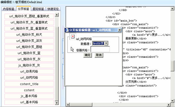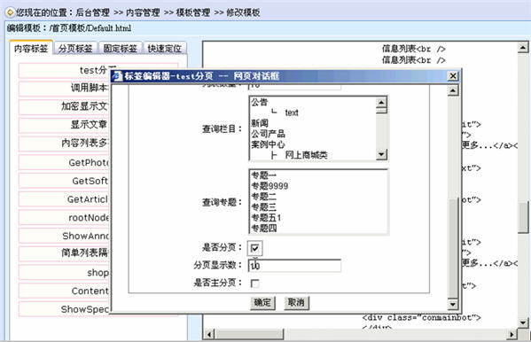 首先,我們進入到首頁模板編輯模式,為模板添加內(nèi)容標簽。內(nèi)容標簽是用于……。我們將名為“test分頁”的內(nèi)容標簽拖拽到右邊的模板編輯框的相應位置。然后系統(tǒng)會彈出標簽編輯器的對話框,在這個對話框里,我們可以設定內(nèi)容查詢的欄目、專題、選擇分頁,分頁顯示數(shù),勾選是否主分頁等,如下圖:
