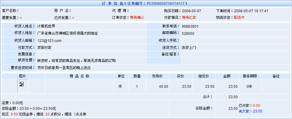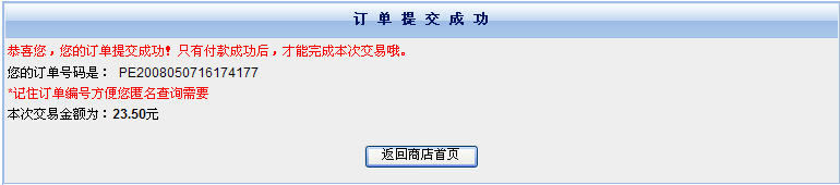 當游客訂購商品并完成支付后,游客將獲得一個唯一的訂單編號。游客可在網(wǎng)店頁面中通過訂單編號與收貨人姓名查詢自己的訂單情況,如:訂單的商品列表、商品單價總價,付款情況等,游客可以通過網(wǎng)絡(luò)隨時查詢并知道自己的訂單被受理了嗎?訂單是否已經(jīng)開始配送?同時,游客不用擔心自己的訂單資料泄露出去,因為訂單編號和收貨人姓名必須完全正確才能夠查詢訂單。