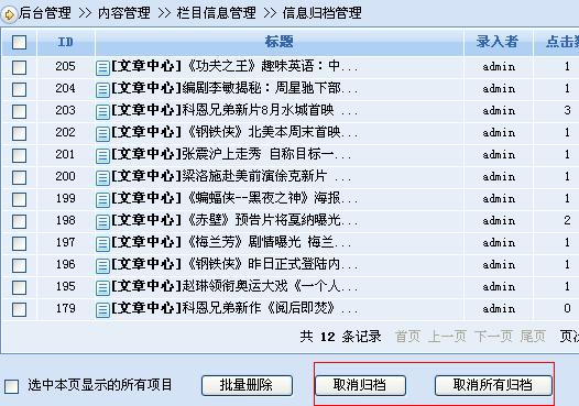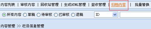 信息歸檔的主要作用是:當(dāng)某些文章過(guò)期了,不需要在前臺(tái)顯示,但又不能刪除,以備以后查詢,我們知道,如果設(shè)為待審核狀態(tài),那么后臺(tái)又老是會(huì)出現(xiàn)在"待審核文章中"的提示,不利于管理;另外,如果刪除到回收站中,被其他管理員不小心清空回收站了,這些文章也就刪除了,所以選擇存放在信息歸檔中是最適合的。
