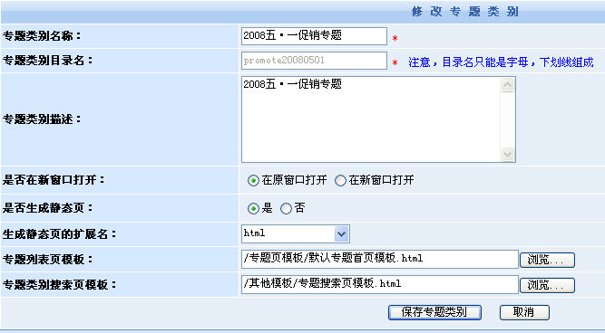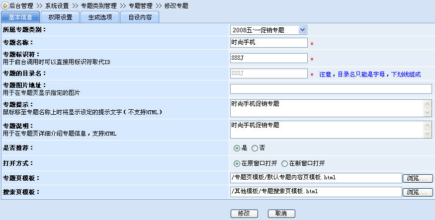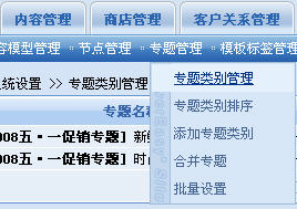 1、添加專題\專題類別與專題類別管理:進行專題和專題類別的添加、修改設(shè)置、刪除。用戶可根據(jù)實際的業(yè)務(wù)需要設(shè)置各種專題類別與專題,如:文章專題、商品專題、圖片專題,又或者是5·1促銷專題、2·14情人節(jié)專題、PhotoShop教學(xué)專題等。要注意的是,專題類別是不能包含內(nèi)容的。
